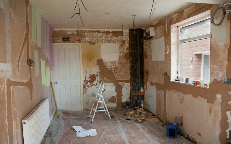 Rewire/re-plumb, ventilation routes set, UFH or radiator pipework installed and pressure tested.